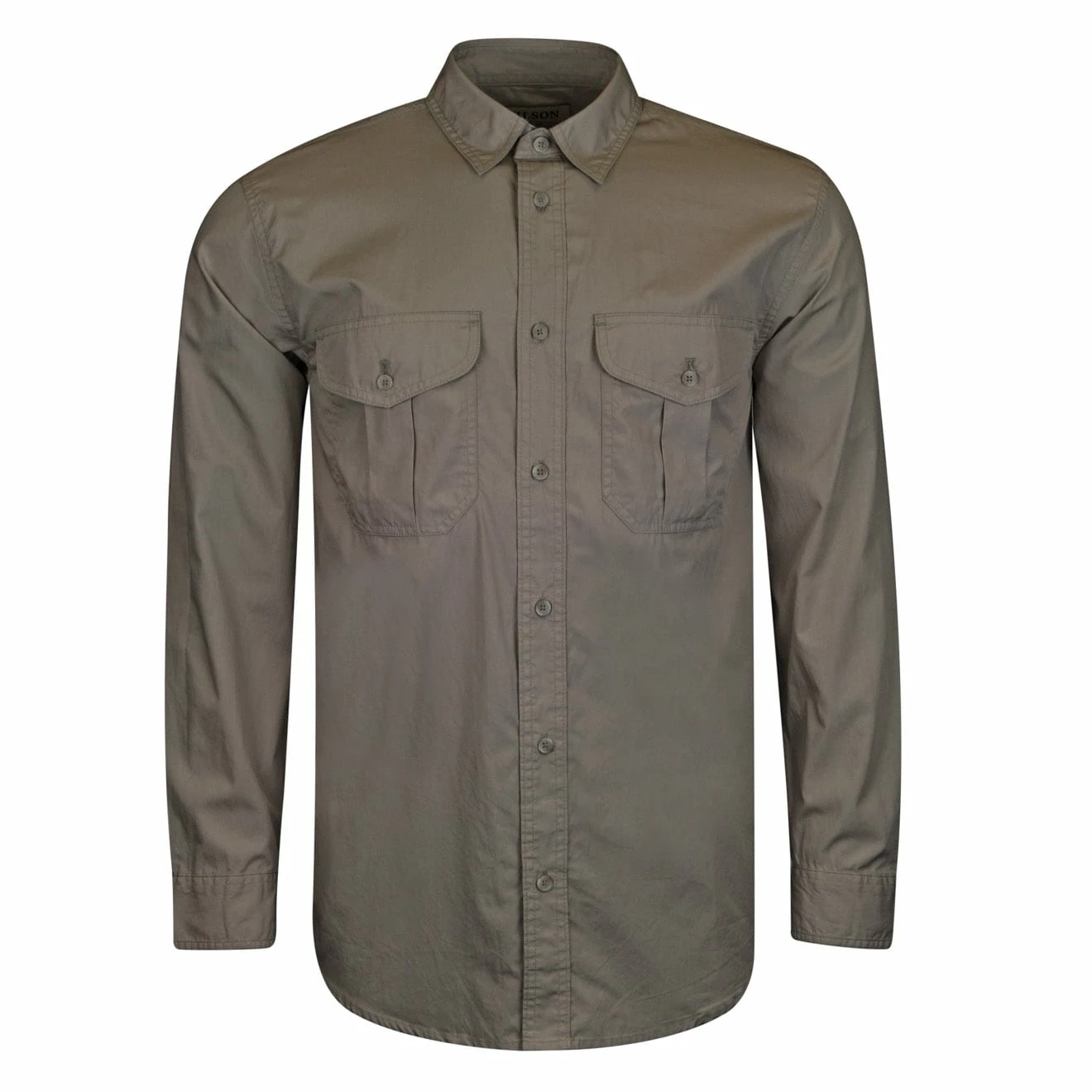 The shirt features a classic open collar, button placket, button close adjustable cuffs and handy chest pockets.