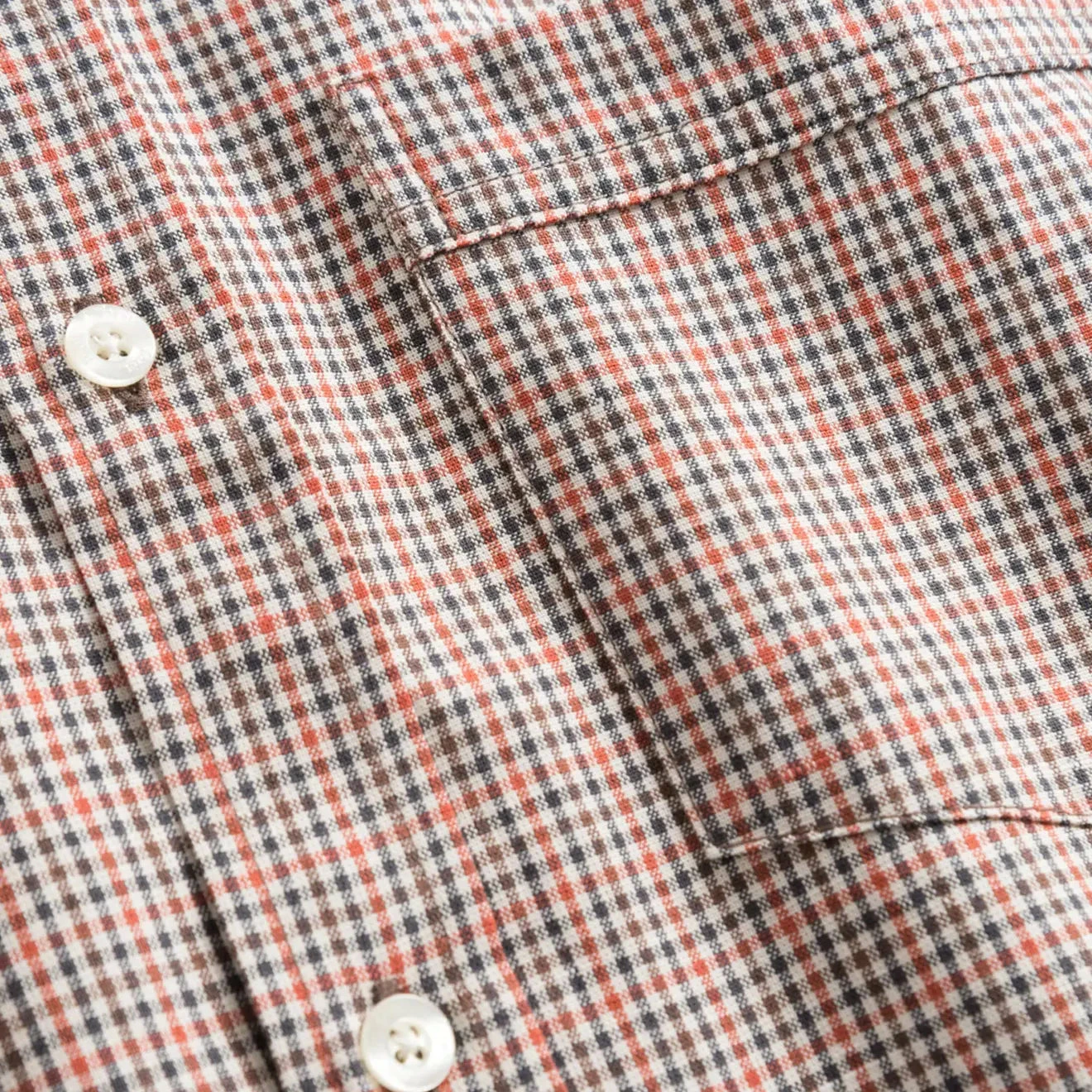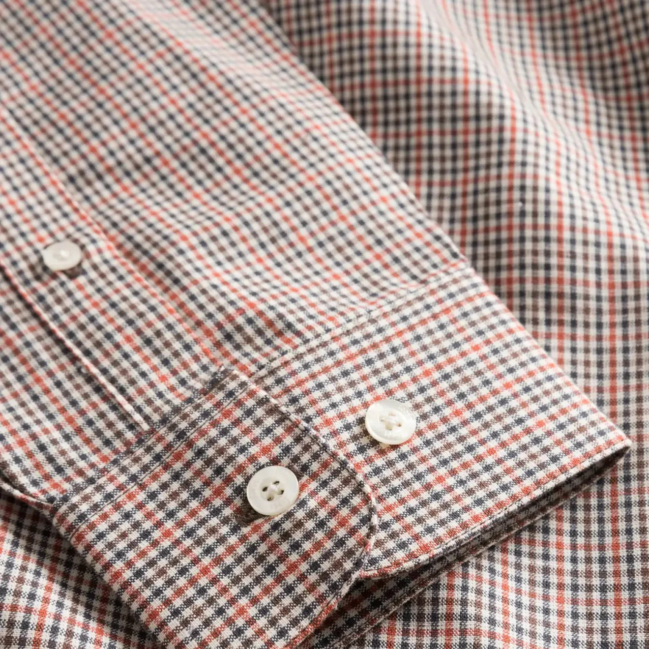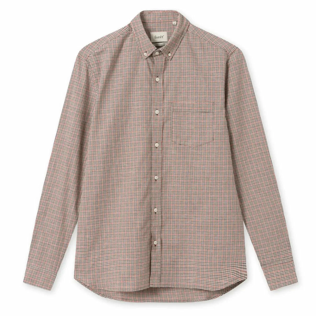 The Forét Mace Shirt features a delicate navy and brown checked pattern cut to a traditional shape finished with cream mother of pearl-look buttons.