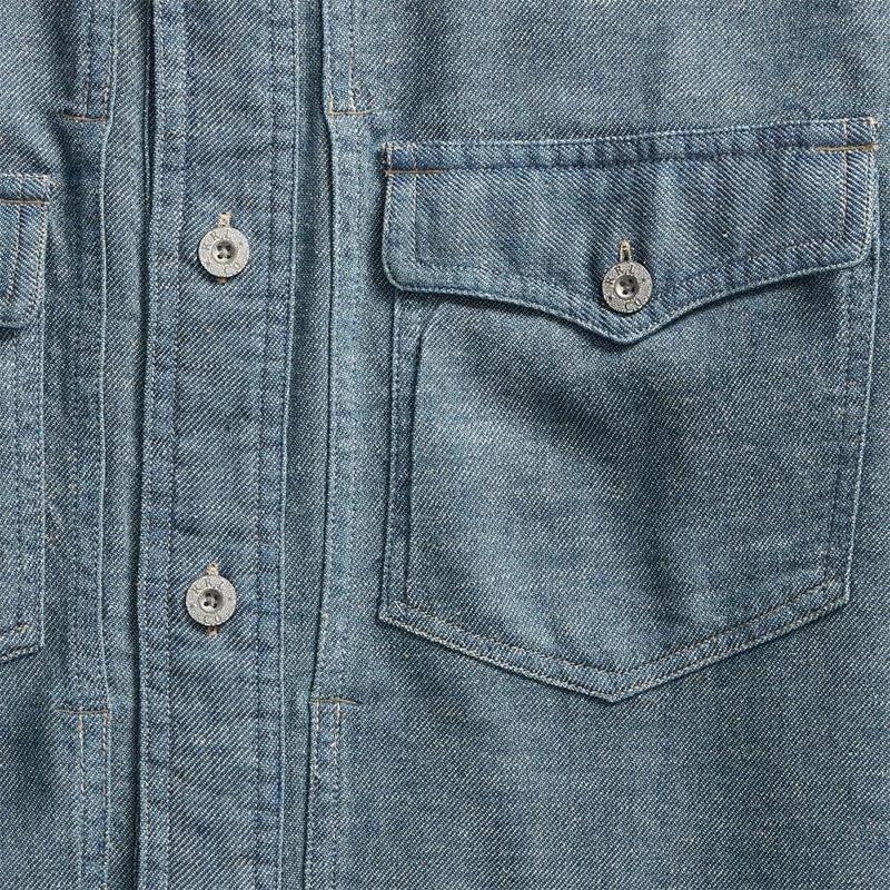 The RRL by Ralph Lauren Linen Cotton Twill Overshirt has been crafted from Japanese indigo-dyed linen-and-cotton twill, cut to a silhouette inspired by a surplus jacket. Garment washed for a worn-in look and feel.